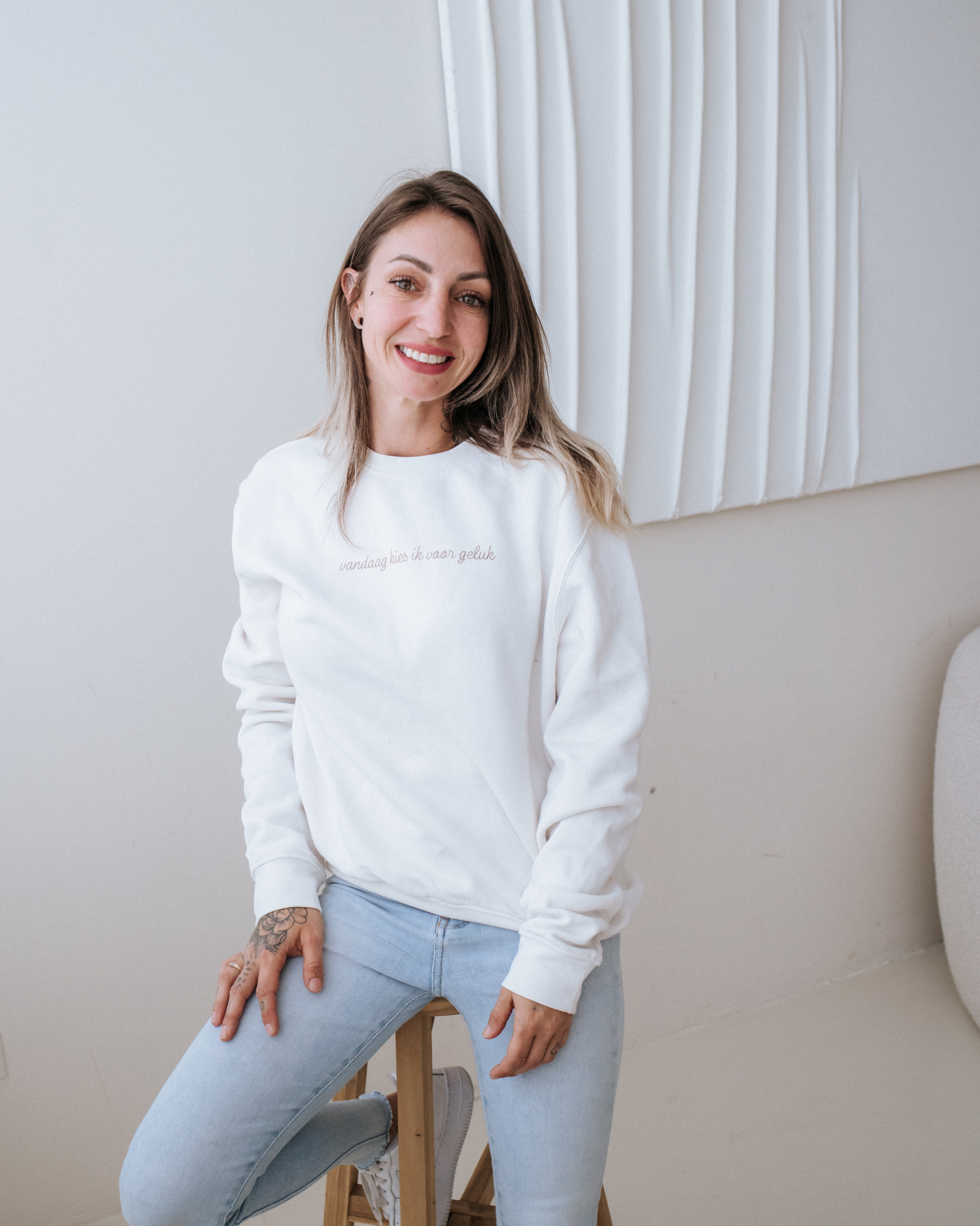Samen twinnen in stijl! Deze schattige matching sweaters voor moeder en kind zijn perfect voor een gezellige dag samen. De truien hebben een zachte beige kleur met de tekst "vandaag kies ik voor geluk" op de borst - een klein detail met een grote betekenis: liefde, geluk en verbondenheid.