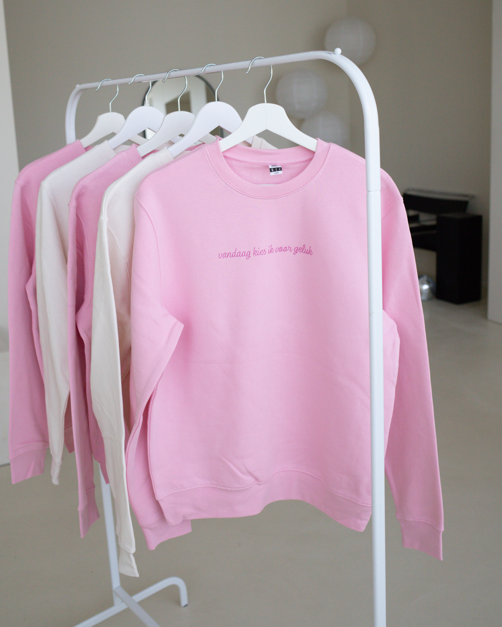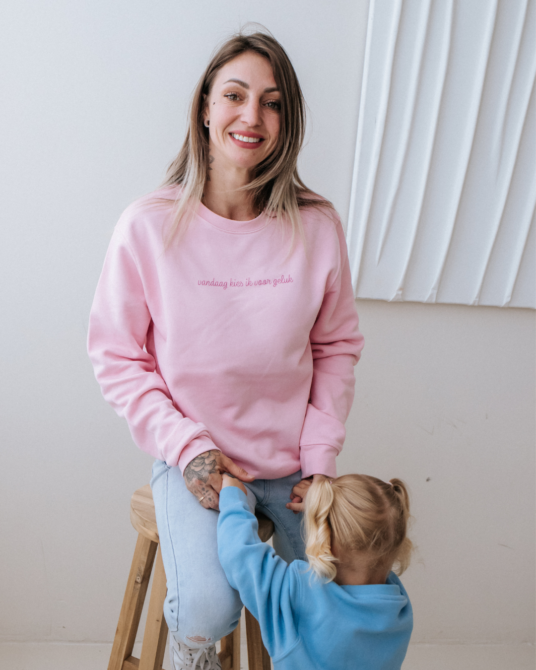 Samen twinnen in stijl! Deze schattige matching sweaters voor moeder en kind zijn perfect voor een gezellige dag samen. De truien hebben een zachte lichtroze kleur met de tekst "vandaag kies ik voor geluk" op de borst - een klein detail met een grote betekenis: liefde, geluk en verbondenheid.